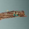 14 karat gold plated sterling silver french wire earrings featuring a 6mm round bezel set faceted sky blue topaz stone and a 10mm x 14mm bezel set copper infused turquoise oblong oval stone. The earrings hang approximately 1.5″. .925 Sterling Silver